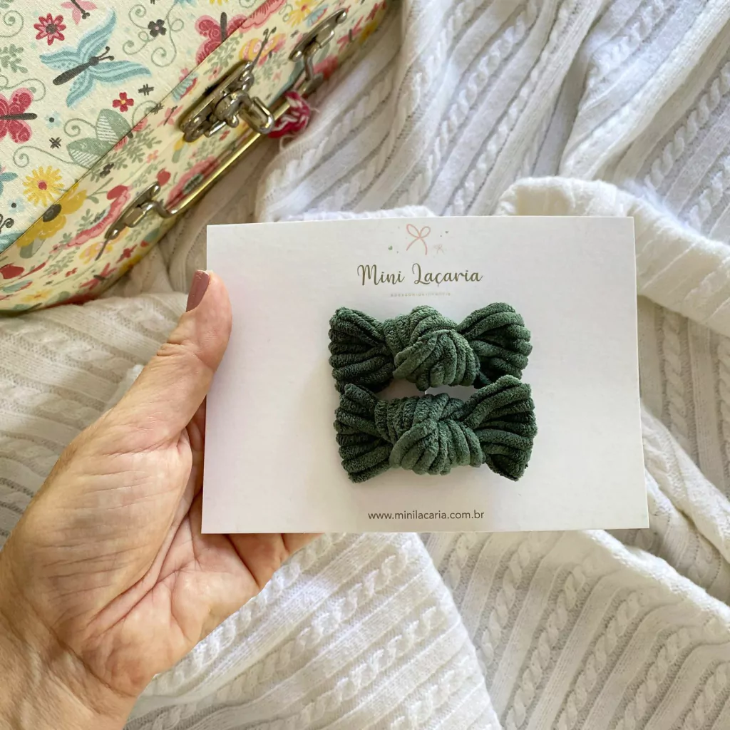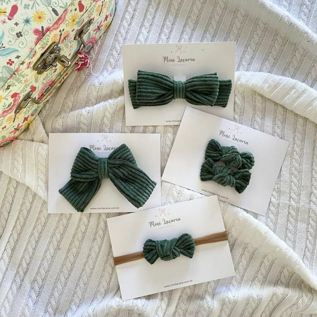 Os laços da Linha Admiração são feitos em veludo cotelê nas variantes de cor offwhite e verde.
