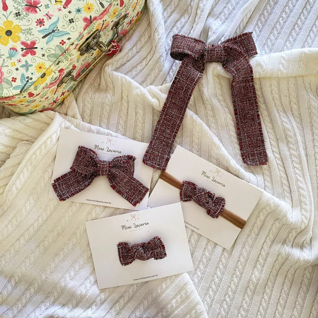 Os laços da Linha Cumplicidade são feitos em num delicado tweed, costurados à máquina com finalização manual.