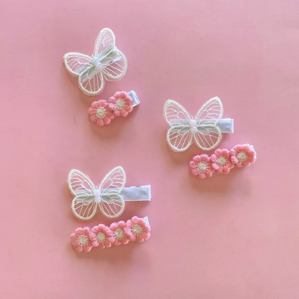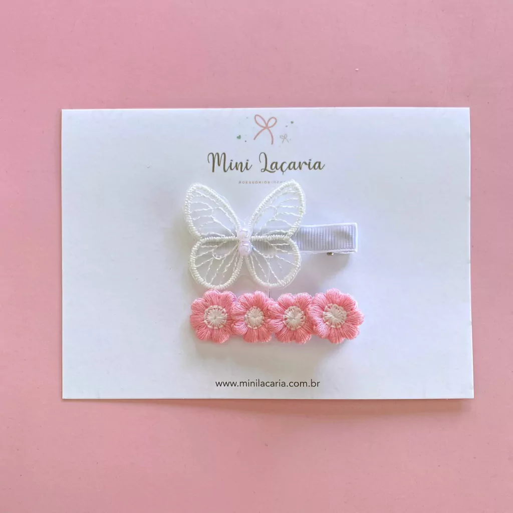 Um clipe leva uma delicada borboleta branca e o outro florzinhas rosas e brancas. Os nossos clipes M são semi-encapados e medem 5,5cm, indicados para menininhas a partir de 1 ano.