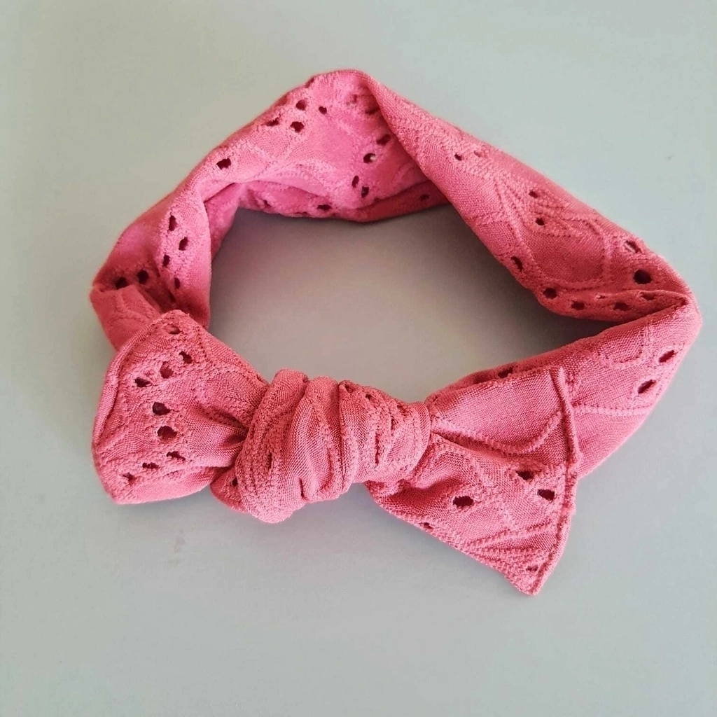 Essa faixa é feita em tecido de malha, possui elasticidade e o nozinho pode ser refeito para se adaptar ao tamanho da cabeça.