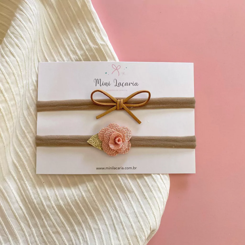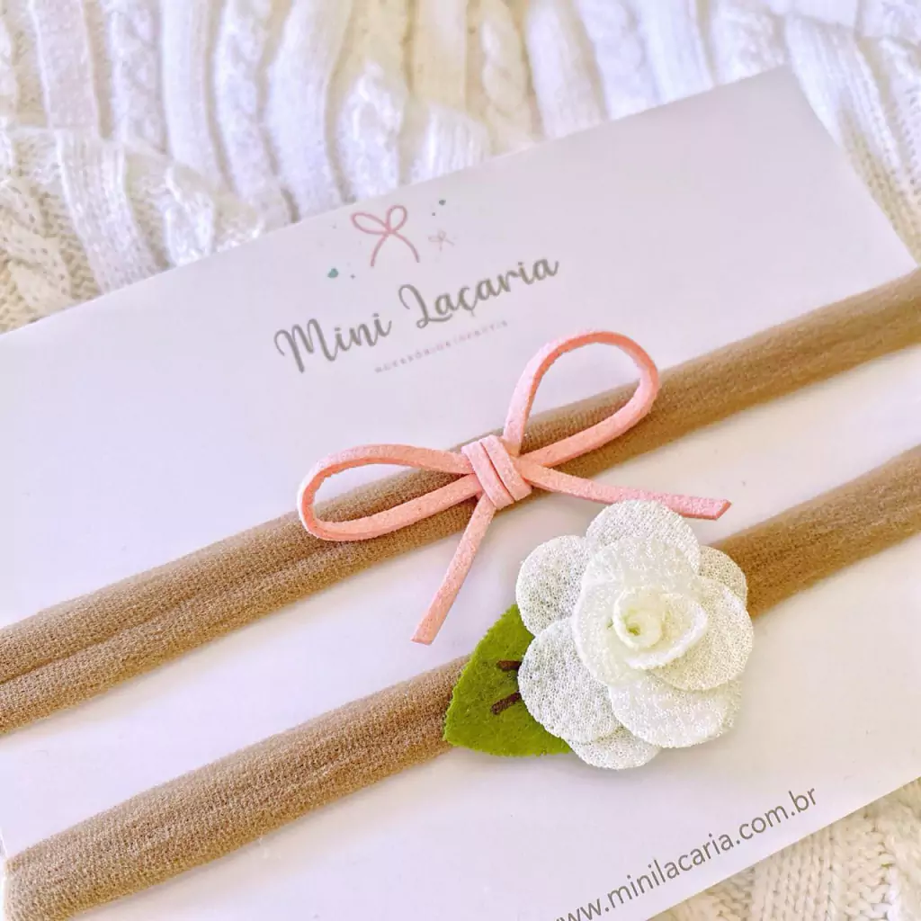 kit Delicado | 2 unidades - Composto por 2 faixinhas, uma com florzinha e outra com laço em camurça.