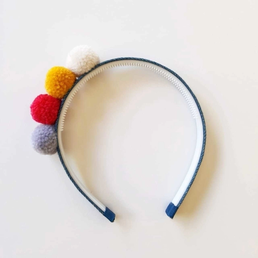 Tiara Filó | unidade - tiara de dentinhos forrada com jeans e decorada com pompons de lã.