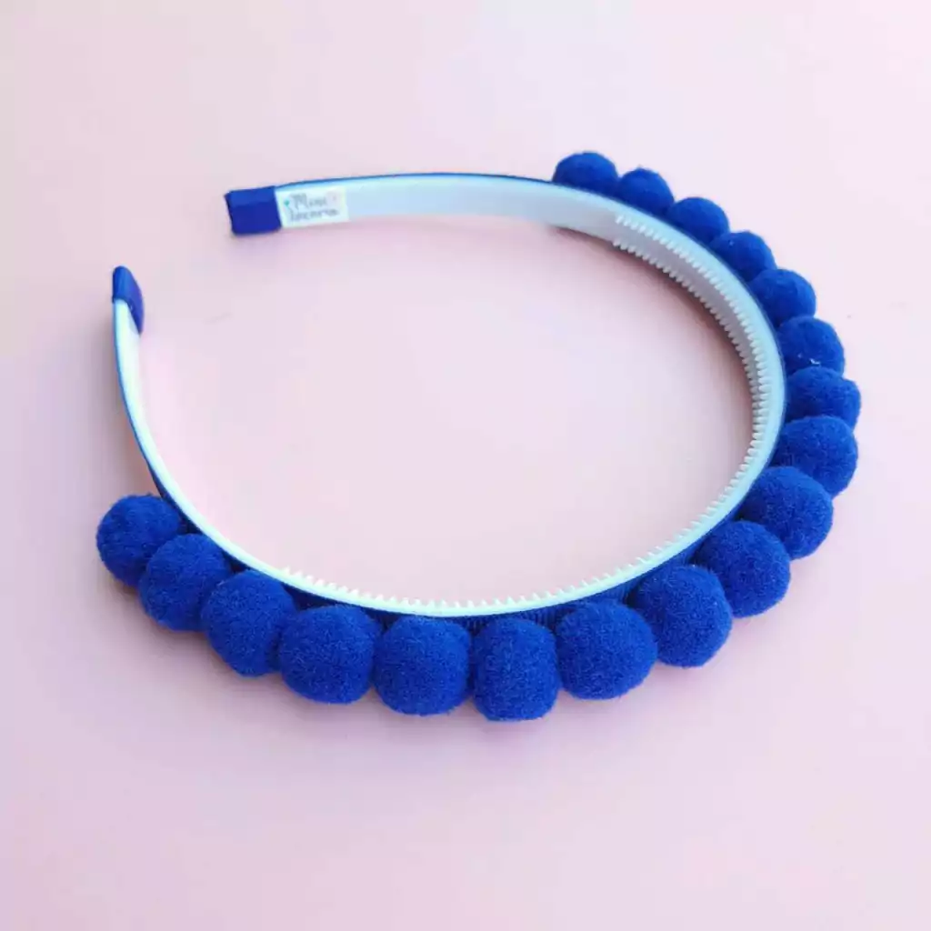 Tiara Júlia | unidade - tiara de dentinhos forrada e decorada com pompons azuis.