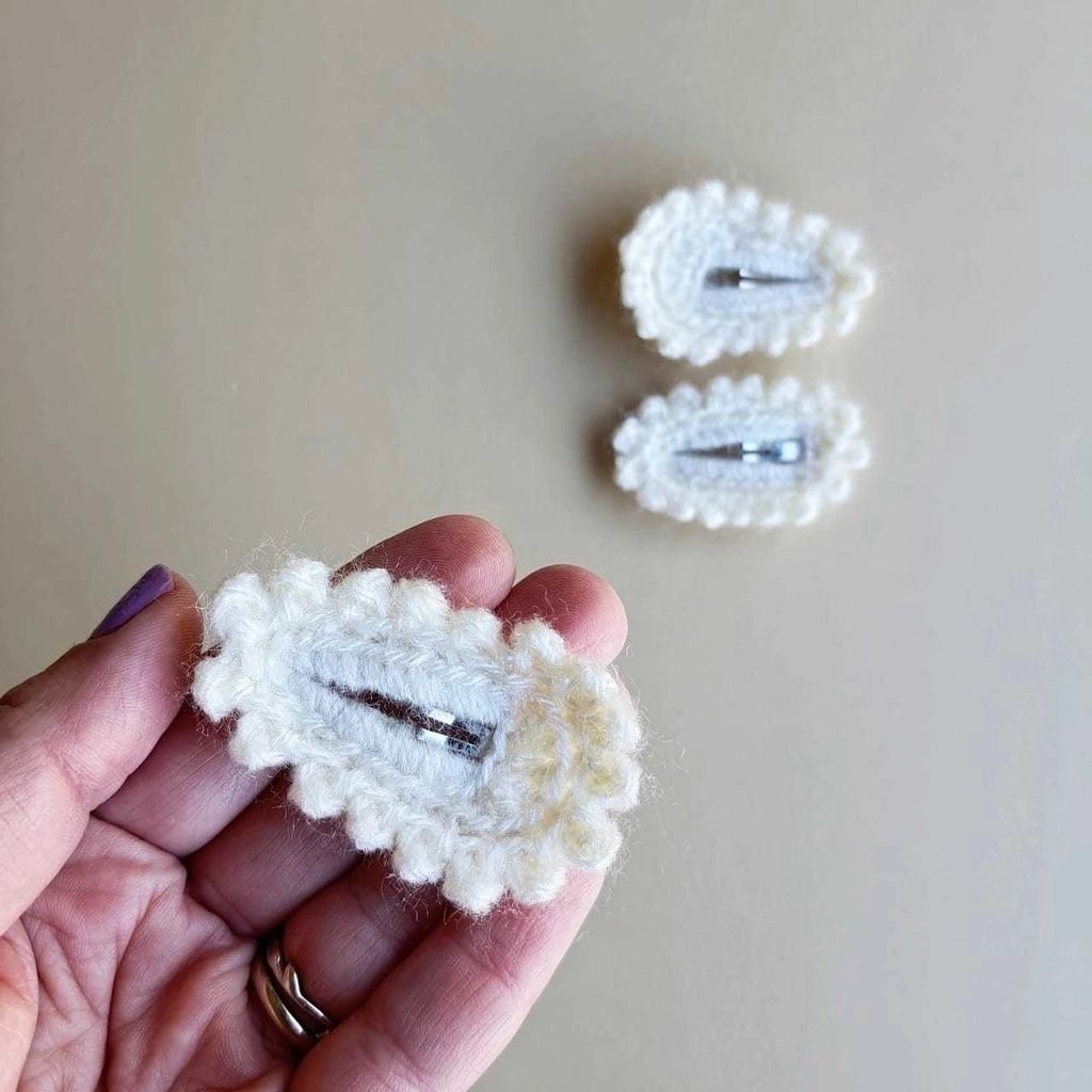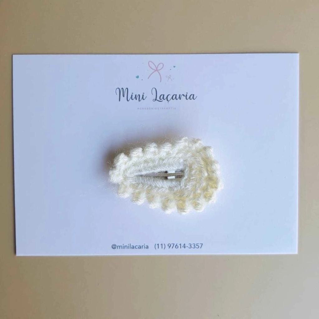 Tic tac com trabalho em crochê em lã cor vanila. A peça mede aproximadamente 6 cm. Ideal para segurar aquela franjinha!