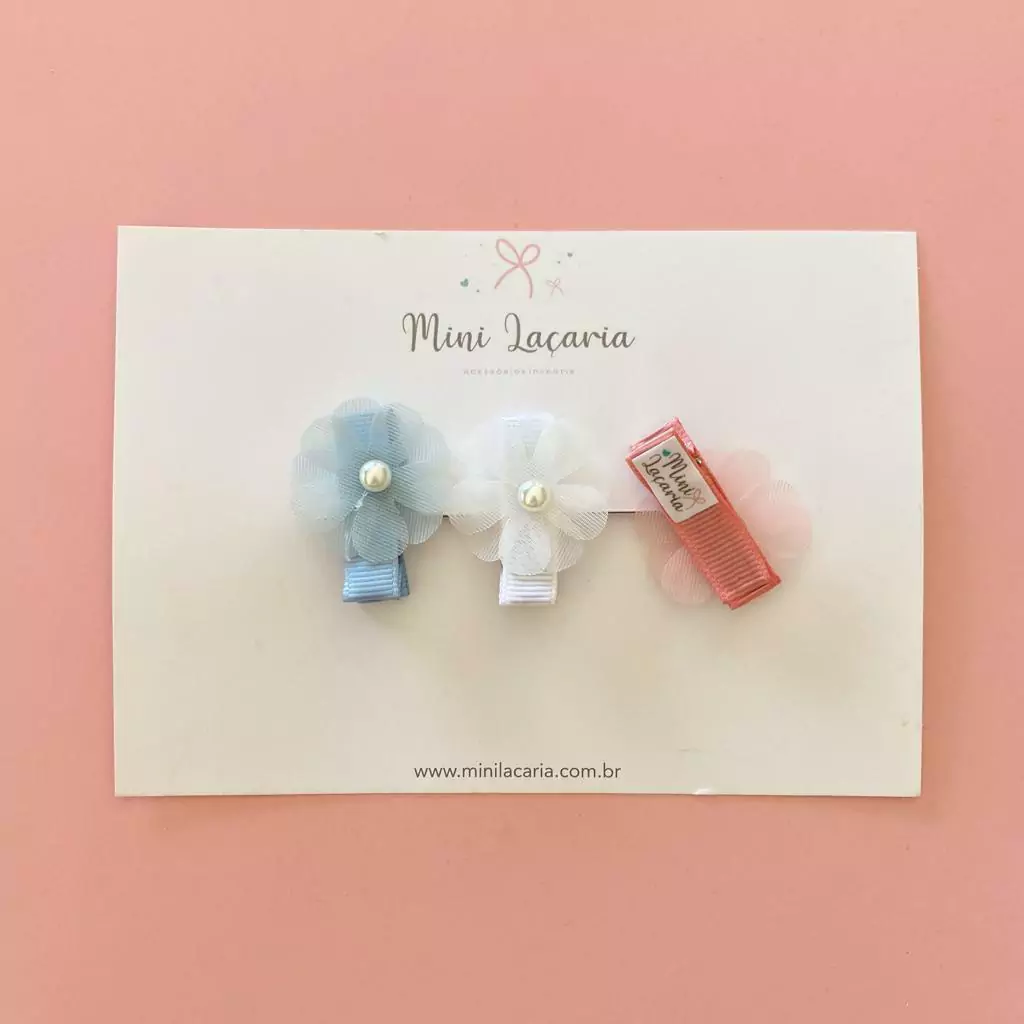 3 hairclips MINI decorados com flores nos tons de azul, branco e rosa.
